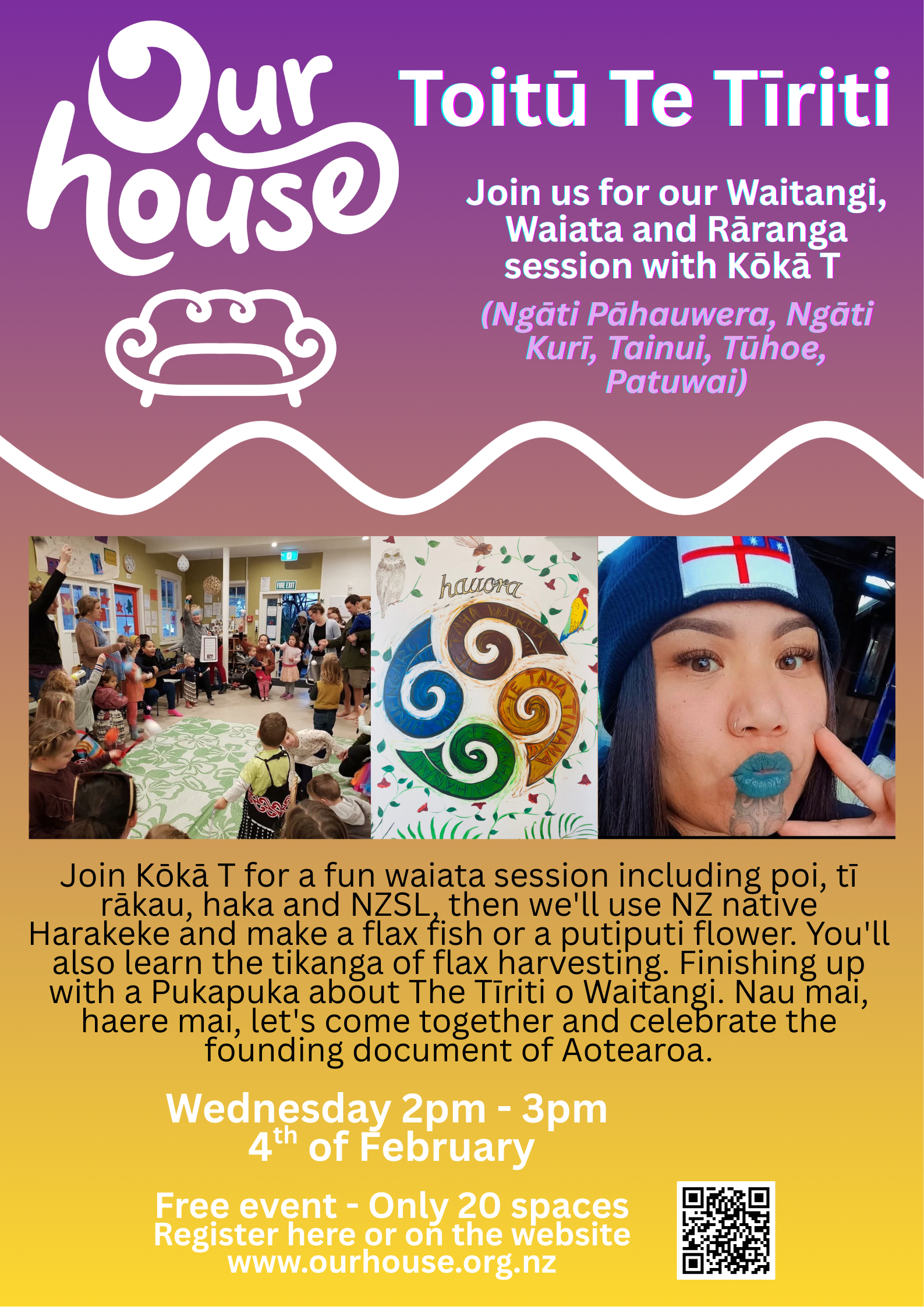 Join Kōkā T for a fun waiata session including poi, tī rākau, haka and NZSL, then we'll use NZ native Harakeke and make a flax fish or a putiputi flower.